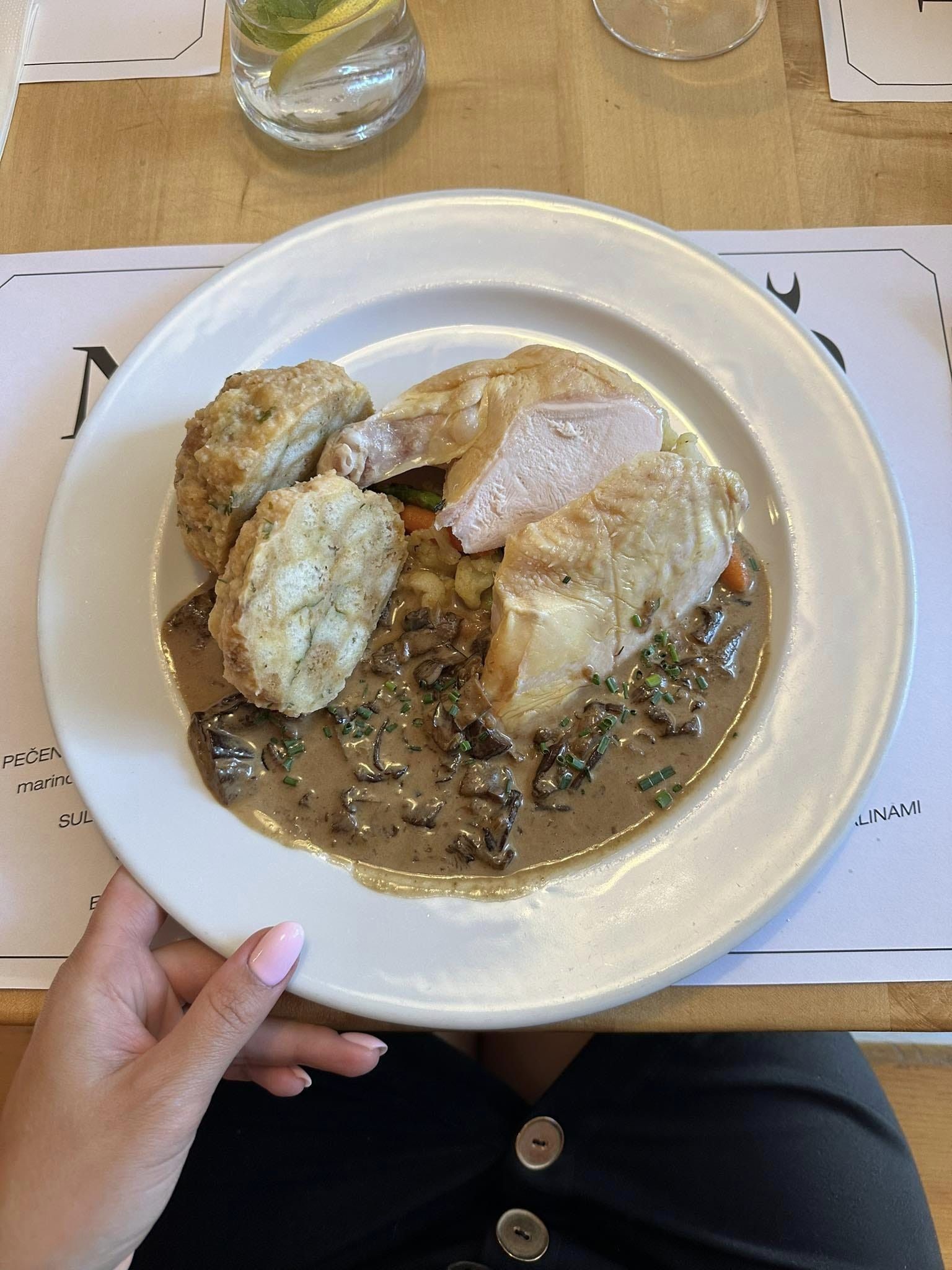na zelenině se smetanovou omáčkou s hříbky a karlovarským knedlíkem, které si tu při